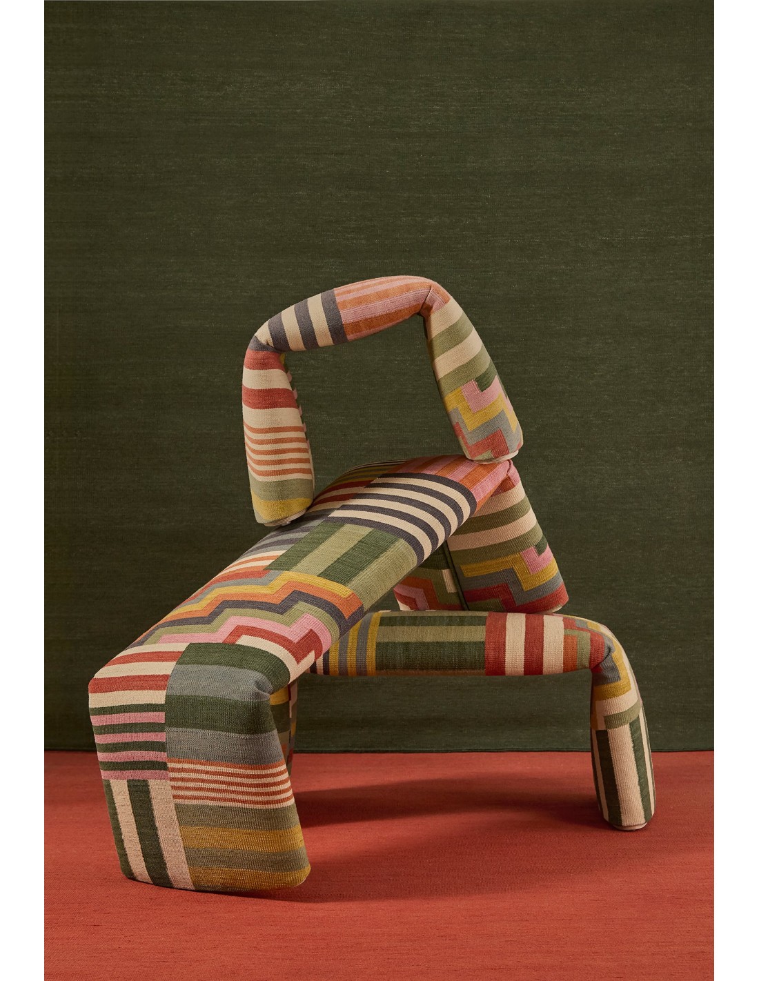 Folded, a bench that reinterprets the traditional concept of the rug, and challenges the traditional boundaries of design. Inspired by the essence of the carpet, this sculptural piece elevates its functionality beyond the floor, transforming into a practical and versatile furniture element. Both the upholstery design and the shape of the bench itself have been conceived as an inseparable duo, where functionality and expressiveness go hand in hand at all times.