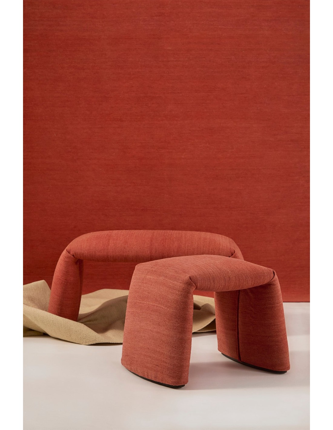 Folded, a bench that reinterprets the traditional concept of the rug, and challenges the traditional boundaries of design. Inspired by the essence of the carpet, this sculptural piece elevates its functionality beyond the floor, transforming into a practical and versatile furniture element. Both the upholstery design and the shape of the bench itself have been conceived as an inseparable duo, where functionality and expressiveness go hand in hand at all times.