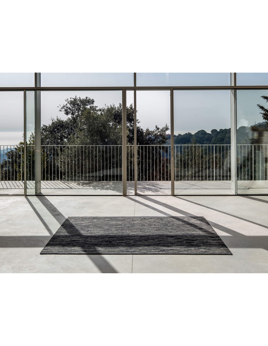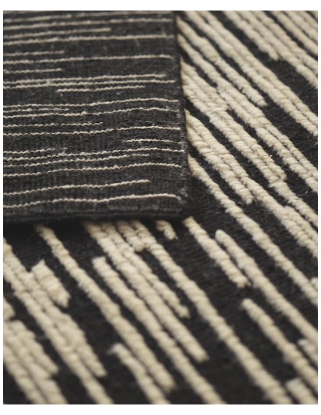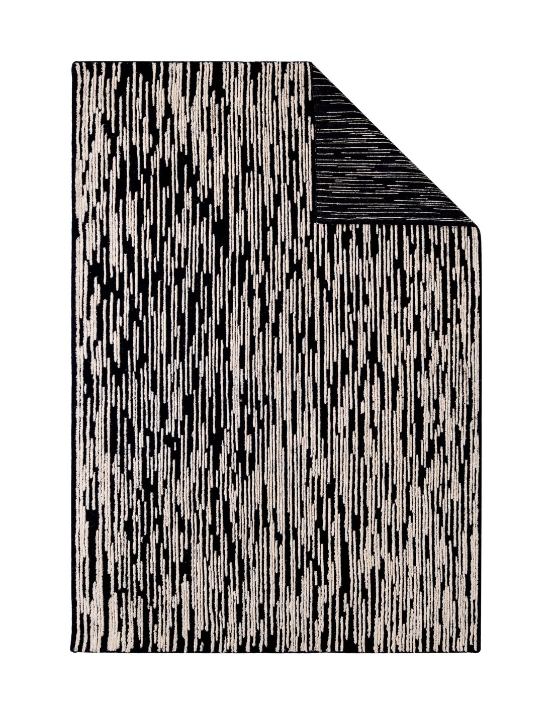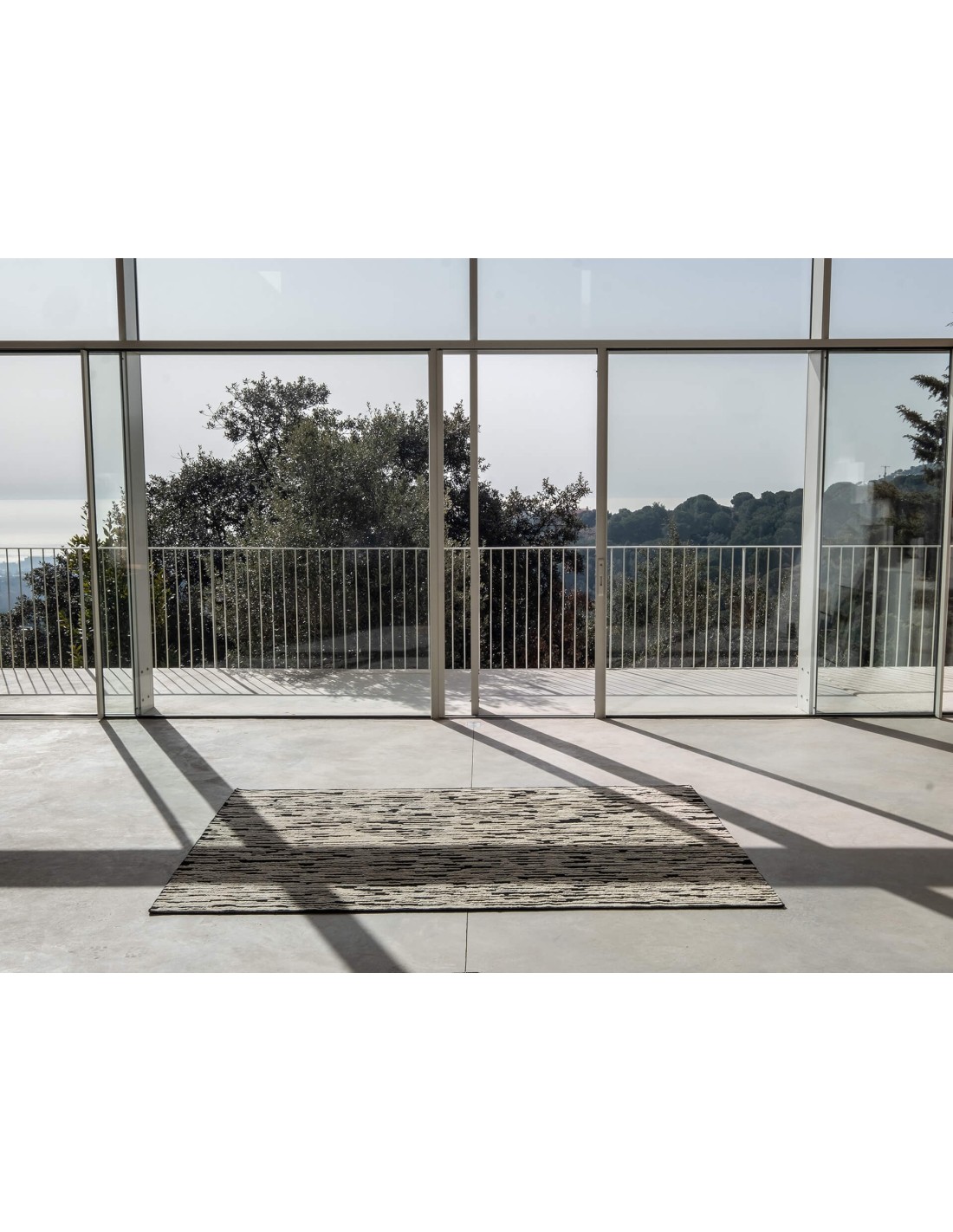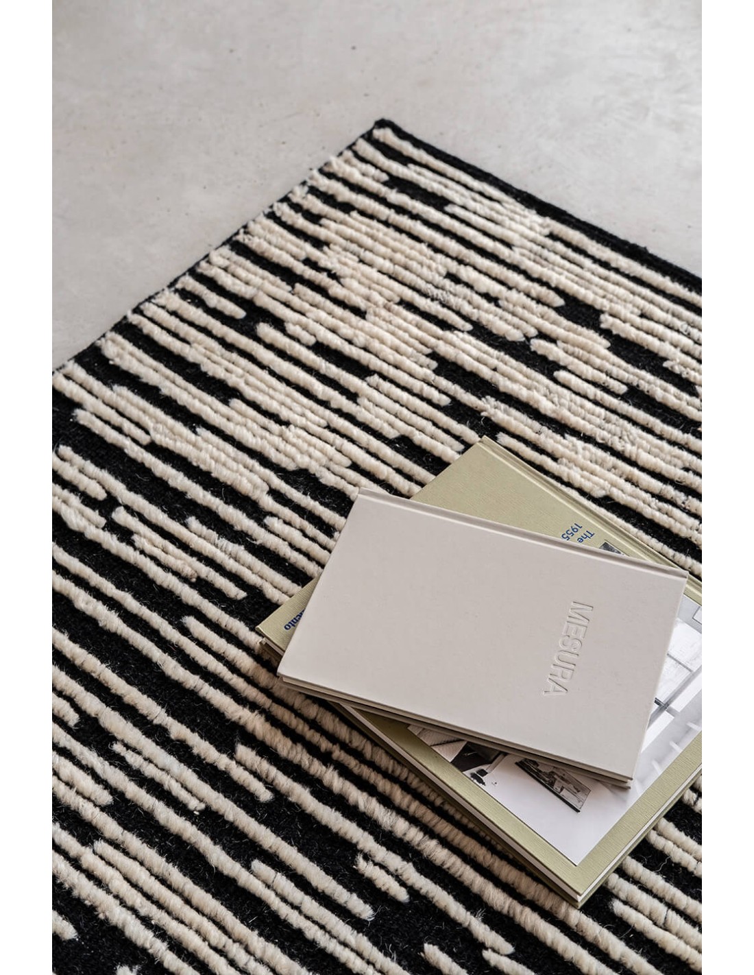 Doblecara is a reversible rug, both sides of which can be enjoyed. The ‘A’ side shows the design with the most personality where its stright black lines stand out in their maximum expression, thanks to the different levels between techniques, while the ‘B’ side is the most subtle and delicate where its raw tone stands out together with soft dark strokes.