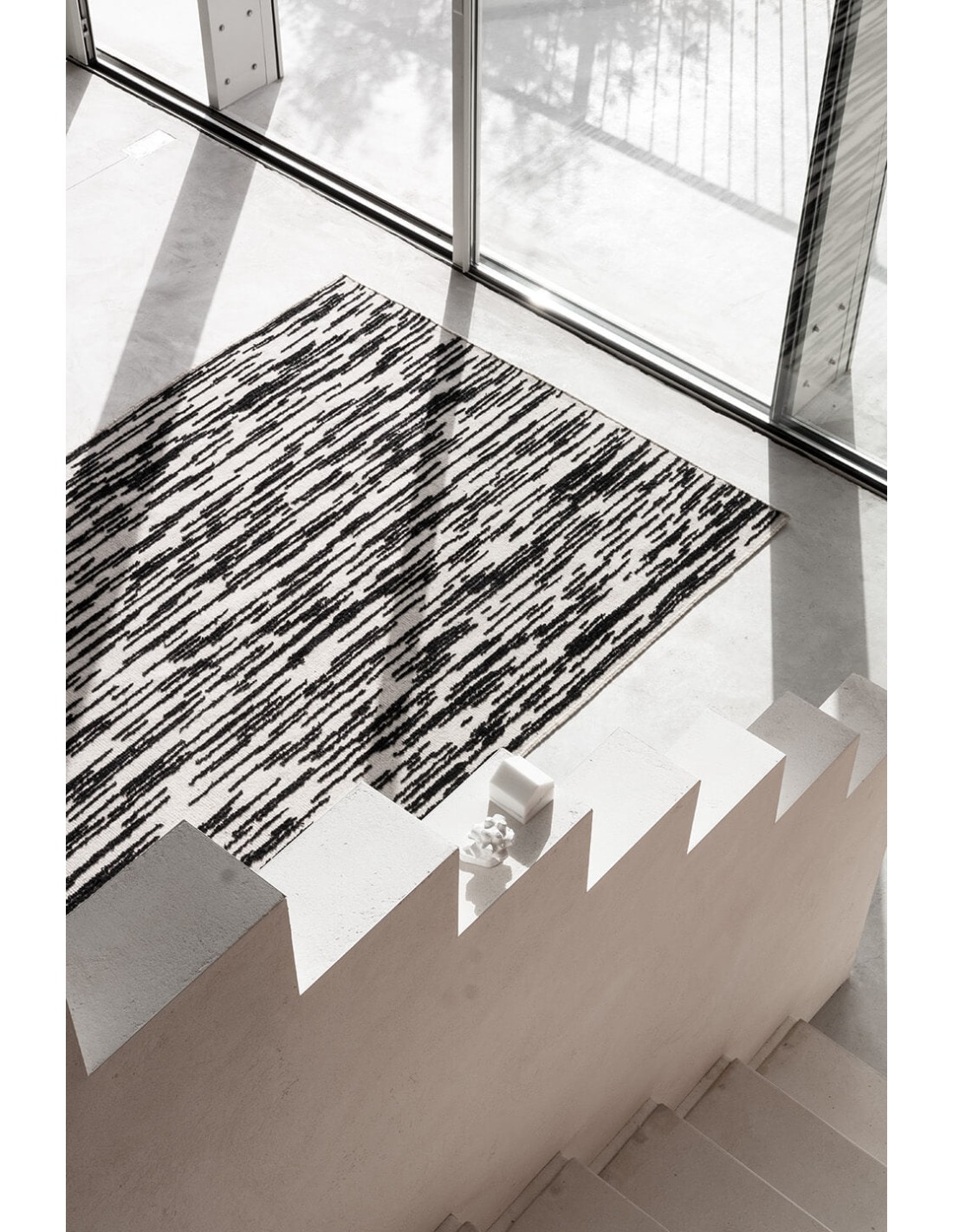 Doblecara is a reversible rug, both sides of which can be enjoyed. The ‘A’ side shows the design with the most personality where its stright black lines stand out in their maximum expression, thanks to the different levels between techniques, while the ‘B’ side is the most subtle and delicate where its raw tone stands out together with soft dark strokes.