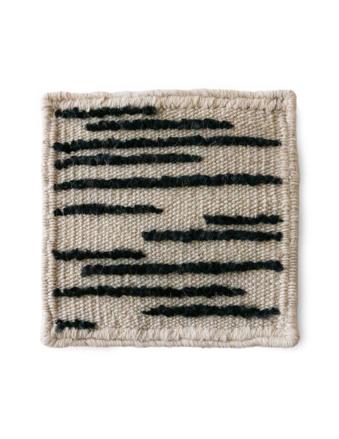 Doblecara is a reversible rug, both sides of which can be enjoyed. The ‘A’ side shows the design with the most personality where its stright black lines stand out in their maximum expression, thanks to the different levels between techniques, while the ‘B’ side is the most subtle and delicate where its raw tone stands out together with soft dark strokes.