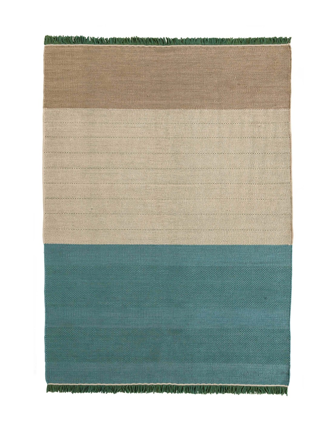 Manual weaving on a vertical or horizontal loom that plays with the intersection between weft and warp. Thin and light rugs that usually feature geometric patterns, as well as firm, resistant and without knots, which makes dhurries clean and easy to maintain rugs.Specifications Tres Stripes Rug Green 170x240