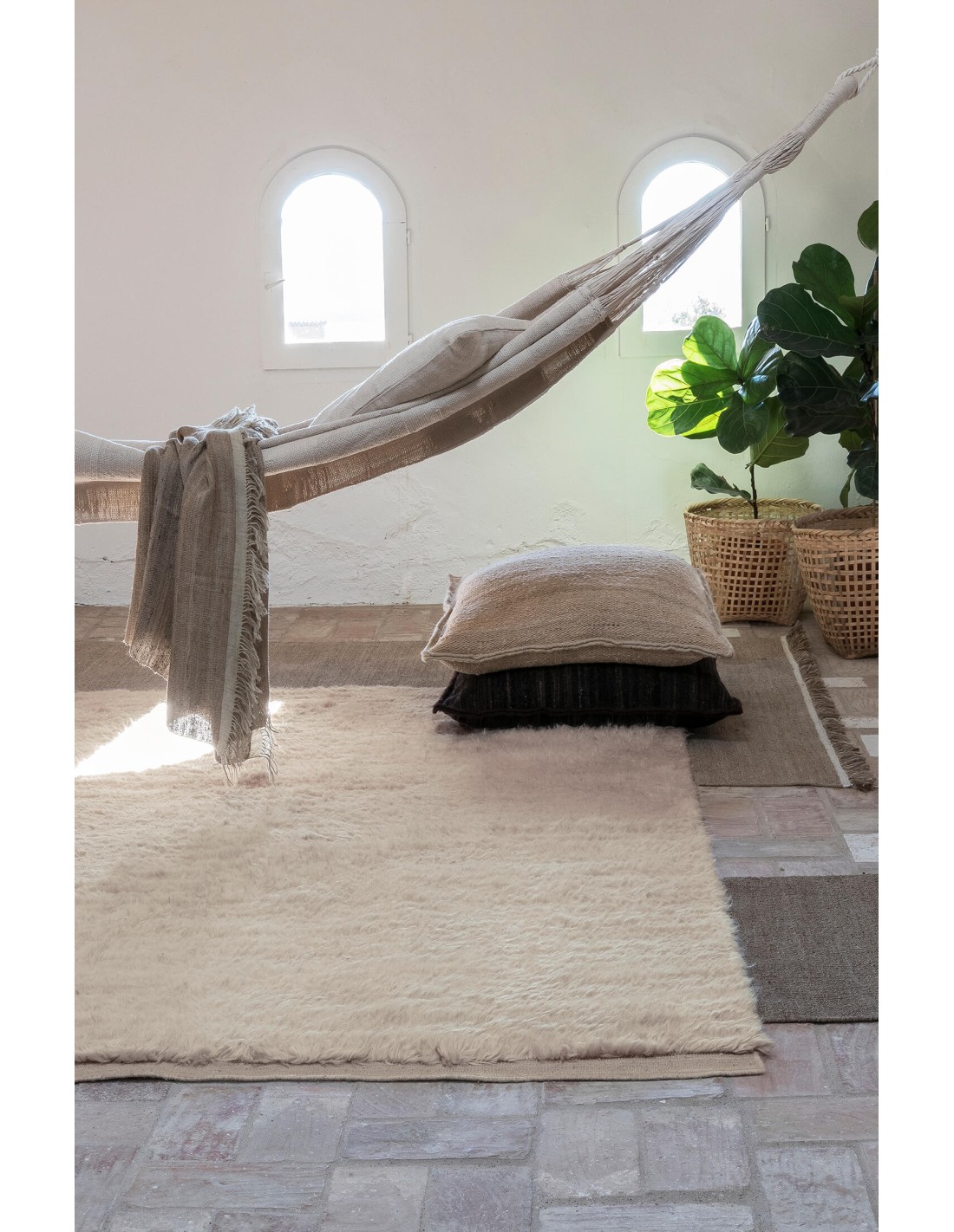 The Wellbeing collection uses hand spun Afghan wool, nettle, jute, linen, Tussar silk as well as cork, wood, raw wool, and raw cotton carefully sourced by nanimarquina’s team, as close as possible to where the pieces from the collection are produced, using traditional craft techniques and local artisans with whom nanimarquina has worked with for a long time.