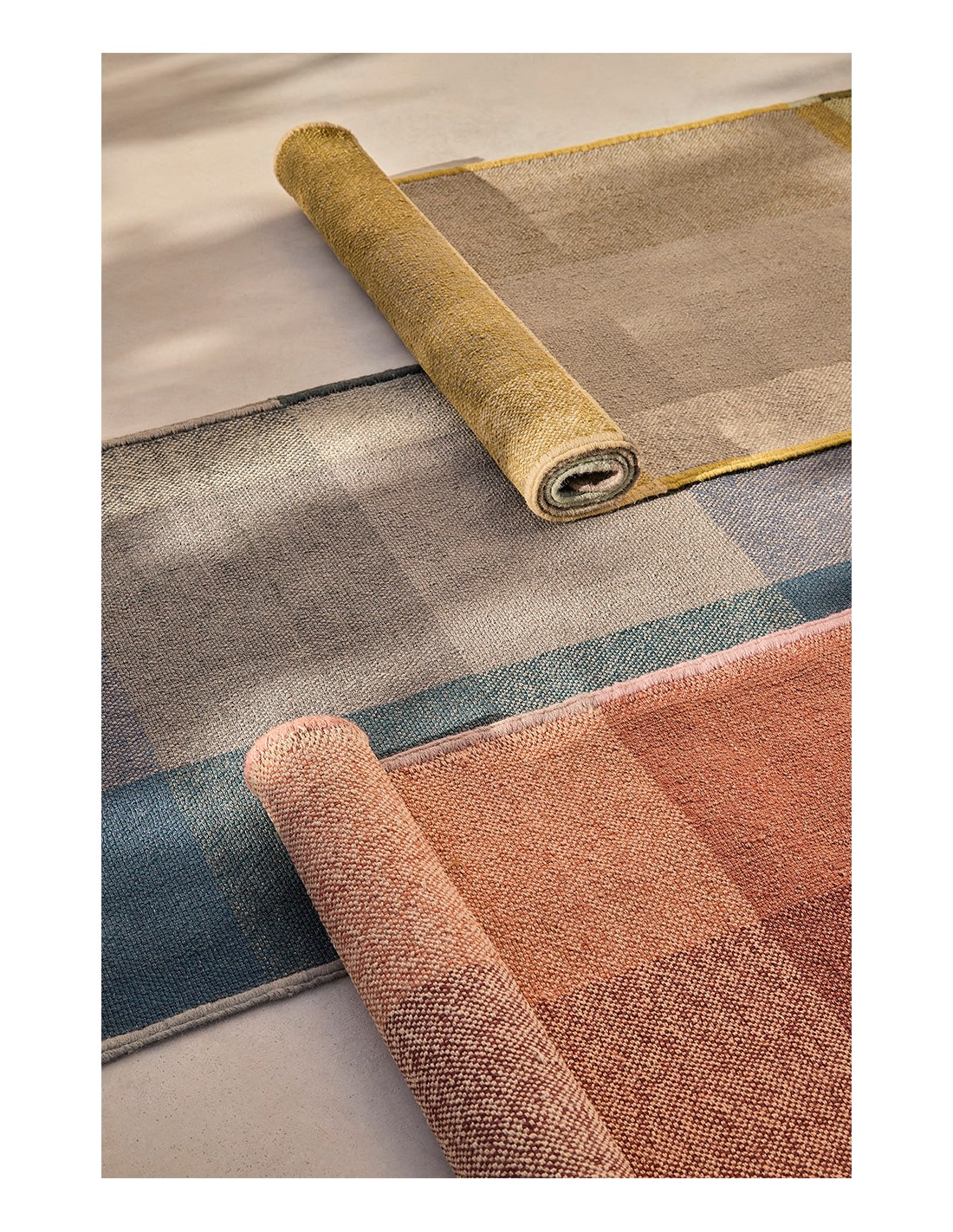 This collection presents a unique visual proposal, where a pattern of parallel and intersecting lines appears and disappears within the same color scale. The result is a monochromatic rug, yet with a depth and texture that evoke a contemporary tartan.